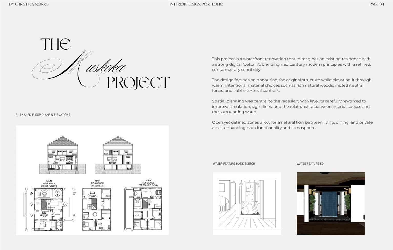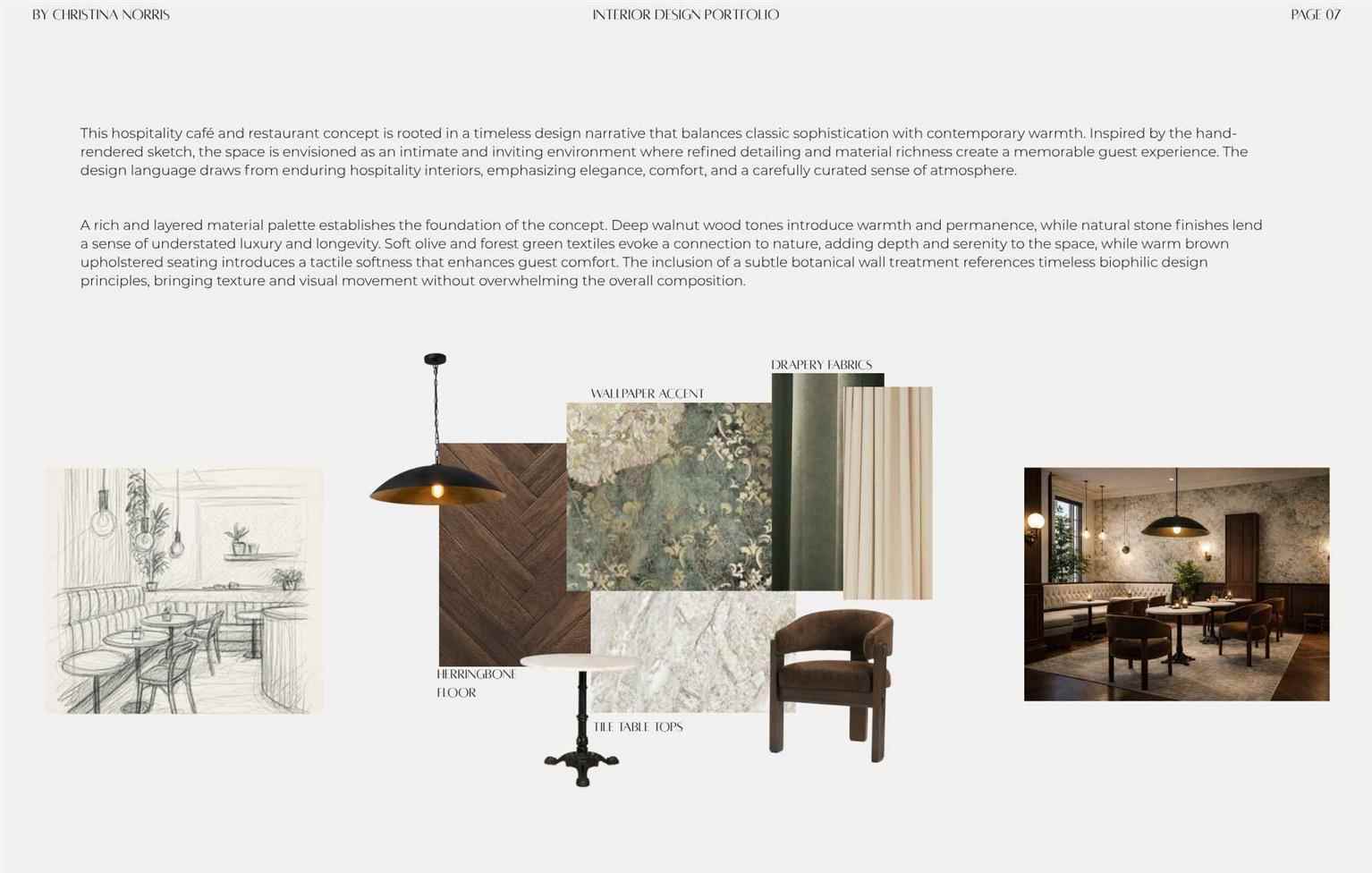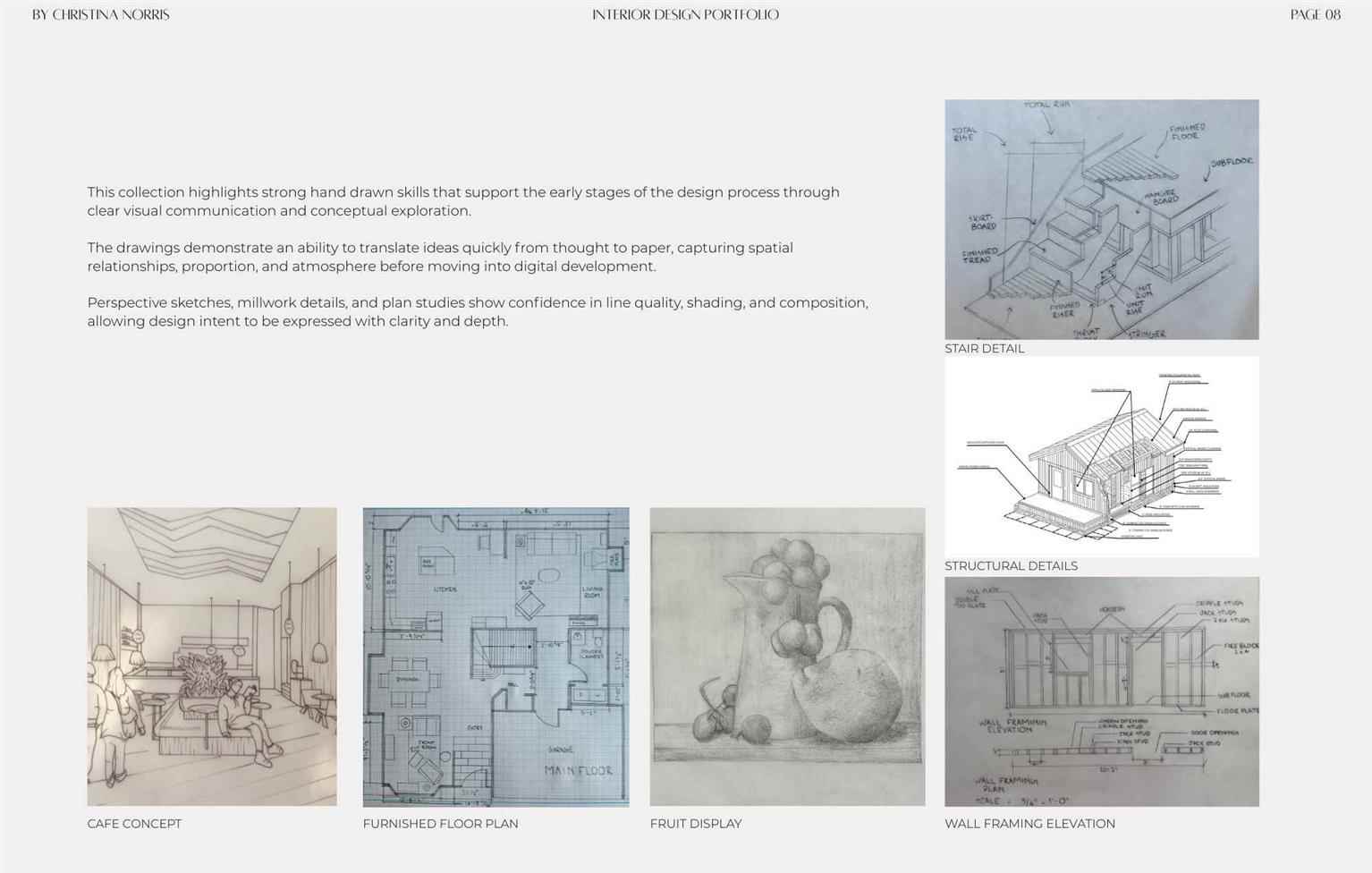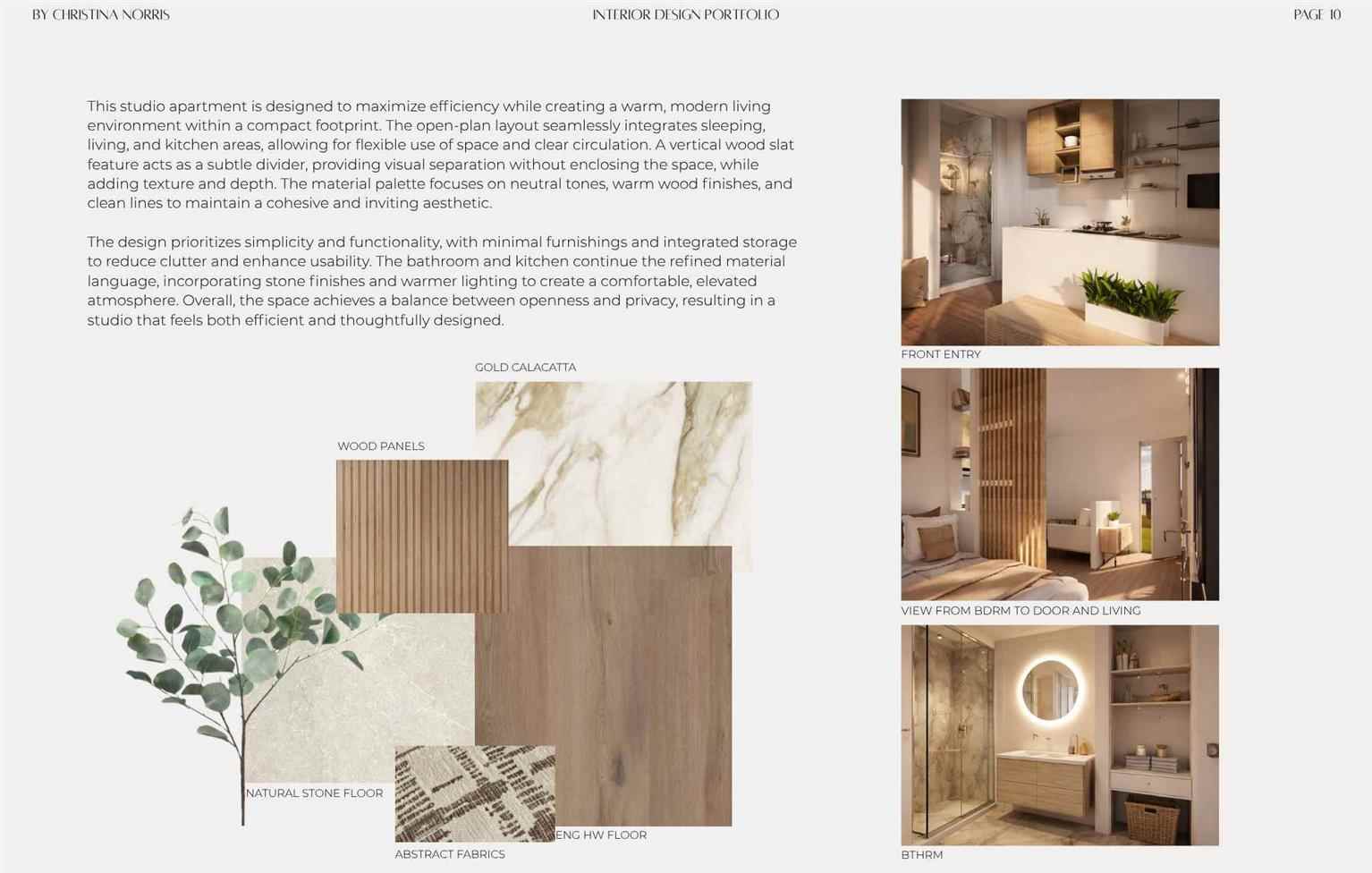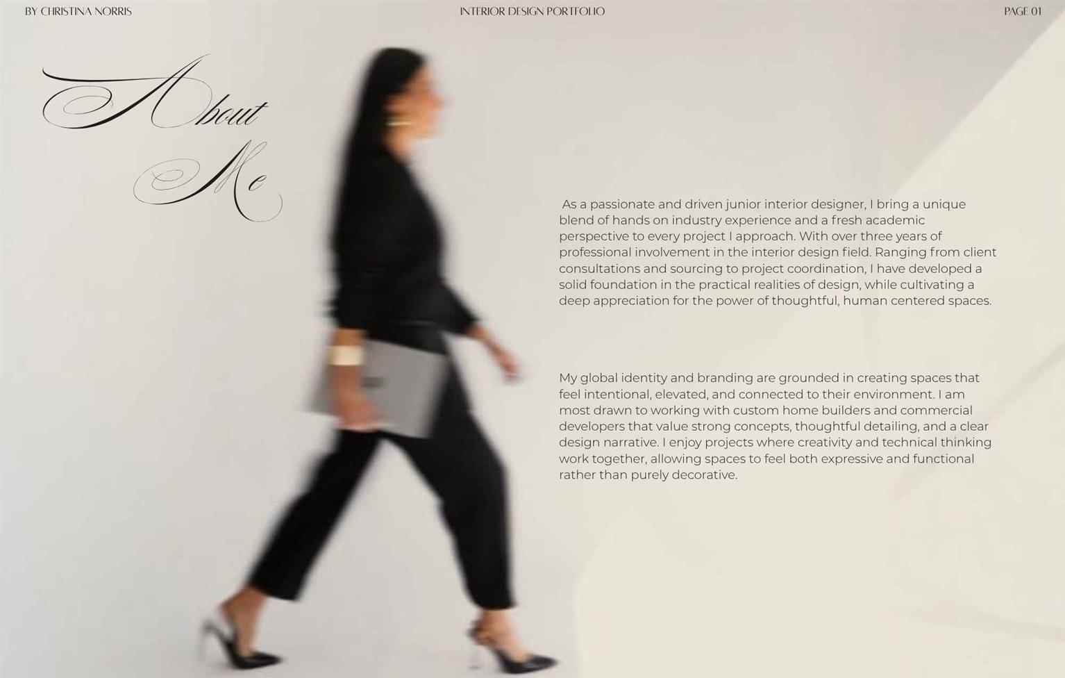 This end-of program portfolio represents the culmination of my journey through interior design education, highlighting the skills, creativity, and technical knowledge I have developed throughout the program. It features a selection of projects that showcase concept development, space planning, material exploration, technical drawings, and 3D visualizations. Each project reflects my growth as a designer and my passion for creating thoughtful, functional, and visually compelling spaces as I move forward in my design career.
